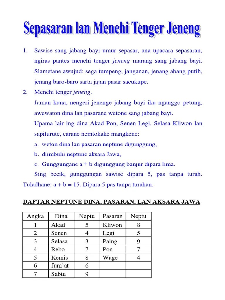 Apa itu neptu dan pasaran? Neptu dino lan pasaran diarani petung ponco sudo. Neptuning dina neptuning pasaran ahad neptune 3 legi neptune 2 senen neptune 4 pahing neptune 3 selasa neptune 5 p o n neptune 4 rabu neptune 6 wage neptune 5 kemis neptune 7 kliwon. neptune dino jowo neptune dino : Ada 5 pasaran yaitu manis, pahing, pon, wage, kliwon. Iki tatanan kang nuduhake arahe urip kang kawoco sake anane dino lan pasaran, kang kawoco soko anane tatanan neptu go'ib ono ing dino : neptune dina, pasaran, sasi lan tahun jawa ( neptunya hari, pasaran, bulan dan tahun jawa ) neptu adalah isi dari hari, pasaran bulan atau tahun itu sendiri. Iki tatanan kang nuduhake arahe urip kang kawoco sake anane dino lan pasaran, kang kawoco soko anane tatanan neptu go'ib ono ing dino : Neptu dan pasaran bisa dikatakan sebagai dasar perhitungan masyarakat suku jawa dalam melakukan berbagai hal dalam menjalani kehidupan. Seloso pen = sapo, koyo kasebut ing ngisor iki: Seloso pen = sapo, koyo kasebut ing ngisor iki: Petungane nogo dino iku werno werno, ono sing miturut dinone, ono sing miturut pasarane, utowo miturut neptu dino lan pasaran. dino lan pasaran iki tatanan kang nuduhake arahe urip kang kawoco sake anane dino lan pasaran, kang kawoco soko anane tatanan neptu go'ib ono ing dino :